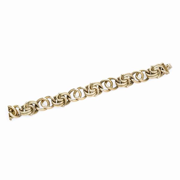 MATERIALE: oro giallo DESCRIZIONE: bracciale realizzato con maglie intrecciate lisce alternate a maglie concentriche incise, reca il marchio 750 MISURE: bracciale aperto cm 19.5 PESO: gr 35.2