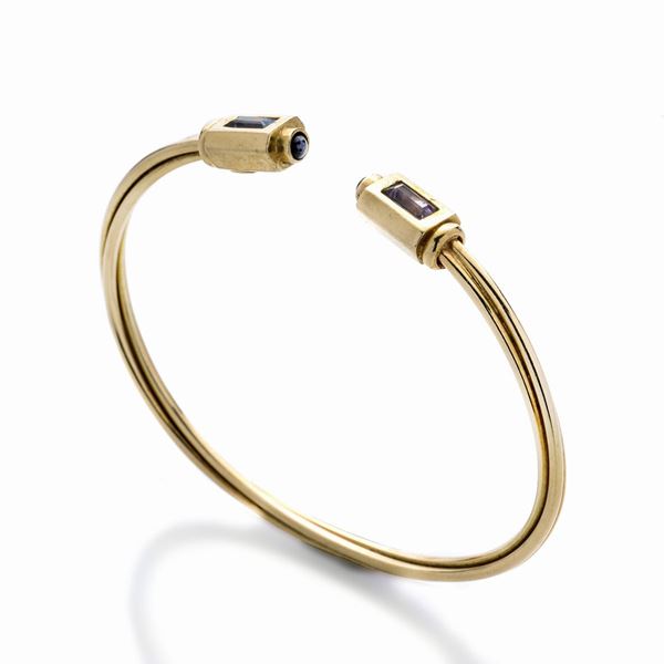 MATERIALE: in oro giallo e quarzi colorati DESCRIZIONE: bracciale rigido contrariè realizzato con finali di ispirazione geometrica impreziositi con quarzi colorati taglio rettangolari e taglio cabochon, corpo a torchon, reca il marchio 750 MISURE: diametro interno cm 6.5 PESO: gr 14.4