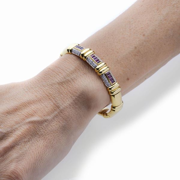 MATERIALE: oro giallo, oro bianco, diamanti e rubini DESCRIZIONE: bracciale rigido realizzato con al centro rubini taglio carrè incorniciati da piccoli diamanti, alternati a maglie baccellate in oro giallo che continuano lungo i lati, reca il marchio 750 MISURE: diametro interno cm 5.5 PESO: diamanti ct 0.90, colore H, purezza SI, rubini ct 1.40, gr 43.7