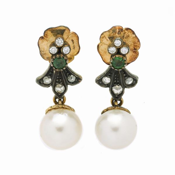 Collana a due fili in perle e paio di orecchini in oro giallo, argento, diamanti e smeraldo