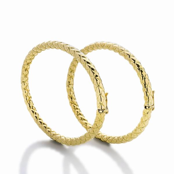 MATERIALE: oro giallo DESCRIZIONE coppia di bracciali rigidi in oro giallo ciascuno, leggermente bombato, realizzato ad imitazione di una corda, recano il marchio 750 MISURE: diametro interno cm 6 PESO: gr 32.1 complessivi