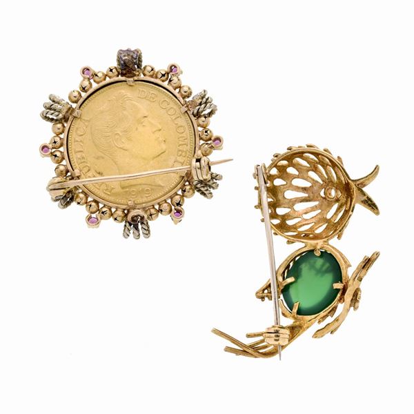 MATERIALE: oro a basso titolo, oro giallo, smeraldo e pietra colorata DESCRIZIONE: spilla realizzata come un canarino stilizzato in oro giallo inciso e corpo impreziosito con pietra verde taglio cabochon ed un'altra spilla pendente con moneta da 5 pesos brasiliani del1919 incorniciata in oro e pietre rosse, il canarino reca il marchio 750 ed è firmato UnoaErre MISURE: rispettivamente cm 3.0x 3.8h; cm 3.4x 3.4h PESO: gr 22.1 complessivi