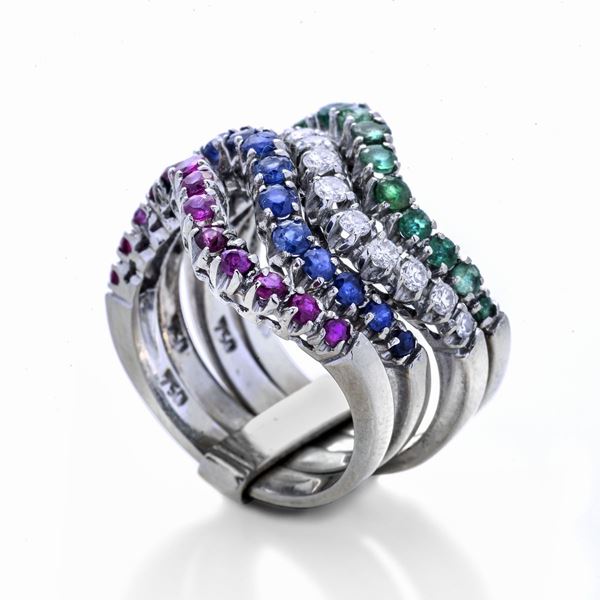 MATERIALE: oro bianco, smeraldi, diamanti, zaffiri e rubini DESCRIZIONE: anello realizzato come una fede indiana composta da quattro fedi ciascuna sagomata e impreziosita con smeraldi, diamanti, zaffiri e rubini taglio ovale, recano il marchio 750 MISURE: anello 10 PESO: gr 11.6