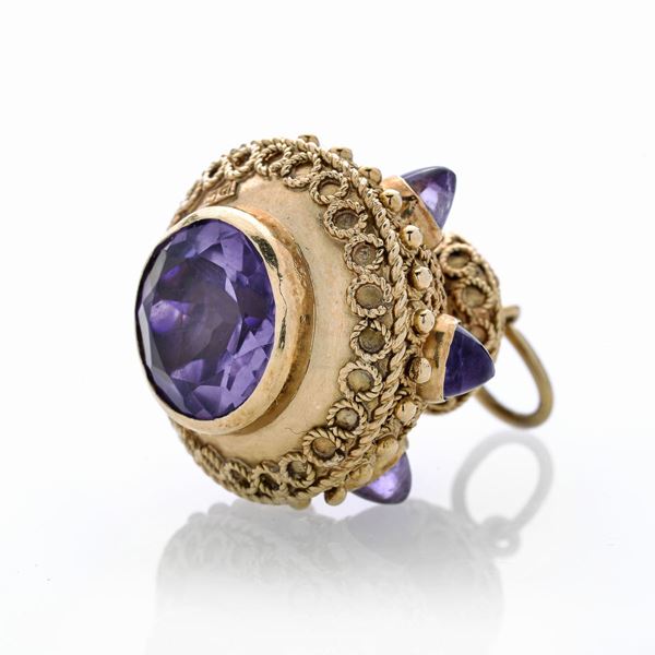 MATERIALE: oro giallo e pietre semipreziose DESCRIZIONE: grande pendente realizzato come una mina impreziosita con pietre semi preziose nei toni del viola MISURE: cm 2.5x3.6h PESO: gr 13.3