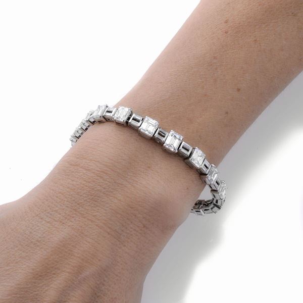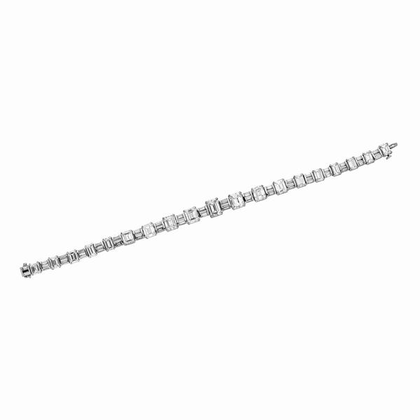 MATERIALE: oro bianco e diamanti DESCRIZIONE: importante bracciale realizzato con diciannove diamanti taglio smeraldo degradè alternati da due diamanti taglio baguette disposti in maniera orizzontale, fermezza impreziosita con diamante taglio smeraldo PESO: diamanti taglio smeraldo ct 16.30 totali , diamanti taglio smeraldo da ct 0.40 (8 diamanti ) - ct 0.50 (3 diamanti ) - ct 1.15 (4 diamanti) - ct 1.22 (2 diamanti) - ct 1.30 (1diamante) - ct 1.46 ( diamante centrale), diamanti taglio baguette ct 1.90 totali, colore J purezza VS-SI, gr 24.8