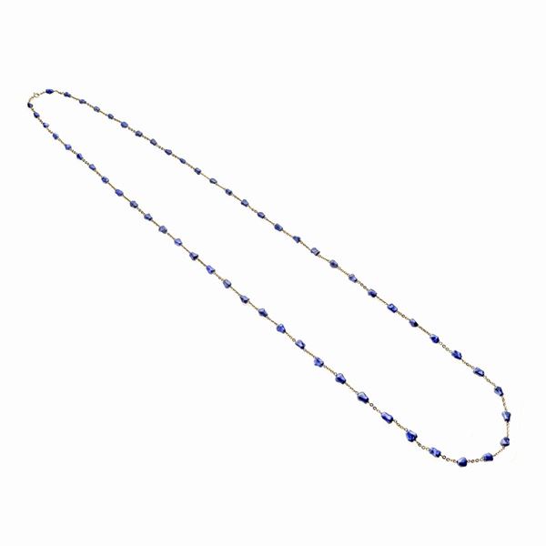 MATERIALE: oro giallo e lapislazzuli DESCRIZIONE: lunga collana realizzata con catena a maglie intrecciate alternate a sassi in lapislazzuli, reca il marchio 750 MISURE: aperta cm 140 PESO: gr 50.1