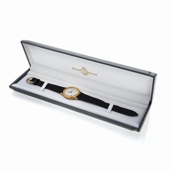 MATERIALE: oro giallo DESCRIZIONE: orologio da polso con cassa circolare e ghiera incisa in oro giallo, anse curve, quadrante color avorio con indici applicati e numeri romani, lancette dauphine, datario ad ore tre, movimento a carica automatica, cinturino in pelle nera stampata originale, firmato Baume & Mercier, reca il punzone 18k, corredato di scatola originale MISURE: diametro quadrante mm 33