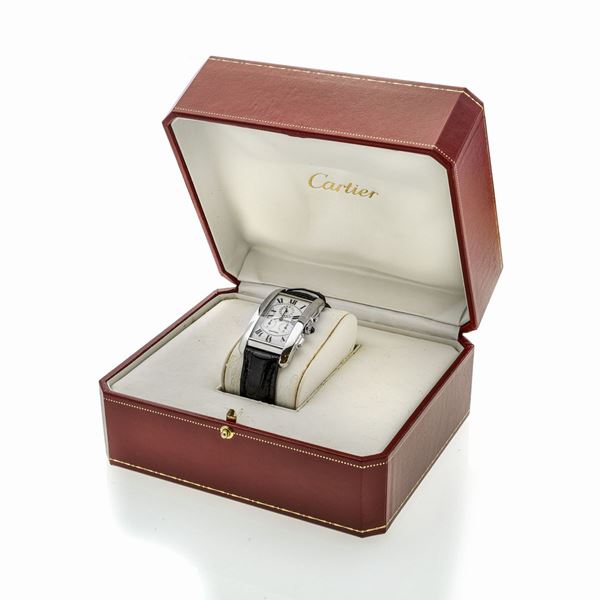 MATERIALE: oro bianco DESCRIZIONE: orologio da signora con ghiera rettangolare, corona con zaffiro cabochon, quadrante con numeri romani, tre quadranti supplementari ad ore 12, 3 e 6, lancette a bastone in materiale blu, movimento al quarzo, cinturino in pelle stampata nera con fibbia originale, corredato di scatola MISURE: quadrante mm 25x35