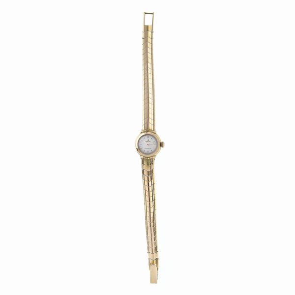 MATERIALE: oro giallo DESCRIZIONE: orologio da signora con cassa circolare, quadrante color champagne con indici applicati e lancette a bastone, movimento a carica automatica, bracciale in oro giallo a maglie piatte leggermente sagomate realizzate ad imitazione del tessuto, reca il marchio 750 MISURE: diametro quadrante mm 16, bracciale aperto cm 18 PESO: gr 37.1