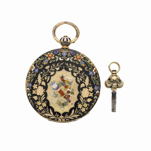 MATERIALE: oro a basso titolo e smalti colorati DESCRIZIONE: orologio da tasca, ghiera con girali di foglie incisi, quadrante avorio inciso con motivo geometrico, numeri romani in smalto blu e lancette breguet, cassa posteriore interamente decorata con ghirlande di fiori e cartiglio al centro in smalti nei toni del nero, del verde, del rosso, del giallo, del blu, e dorato, movimento a carica manuale, corredato di chiavetta originale anch'essa impreziosita con smalti, lievi cadute di smalto, da revisionare MISURE: diametro mm 3.8
