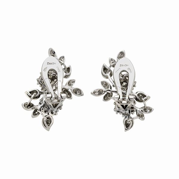 MATERIALE: oro bianco e diamanti DESCRIZIONE: paio di orecchini a clips, ciascuno realizzato come un tralcio di fiori interamente impreziosito con diamanti taglio brillante, recano il marchio 750 MISURE: cm 2.0x 2.8h PESO: diamanti ct 0.50, colore H, purezza VS, gr 9.6