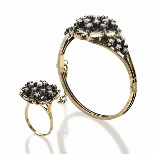 MATERIALE: oro a basso titolo, smalto blu e diamanti DESCRIZIONE: parure composta da bracciale rigido con grande fiore in smalto blu al centro, impreziosito con diamanti taglio brillante che ritroviamo lungo i lati, anello en suite MISURE: diametro interno cm 6; anello 21 PESO: bracciale ct 3.70, colore H, P1 e anello ct 0.50, colore H, P1, gr 34.5