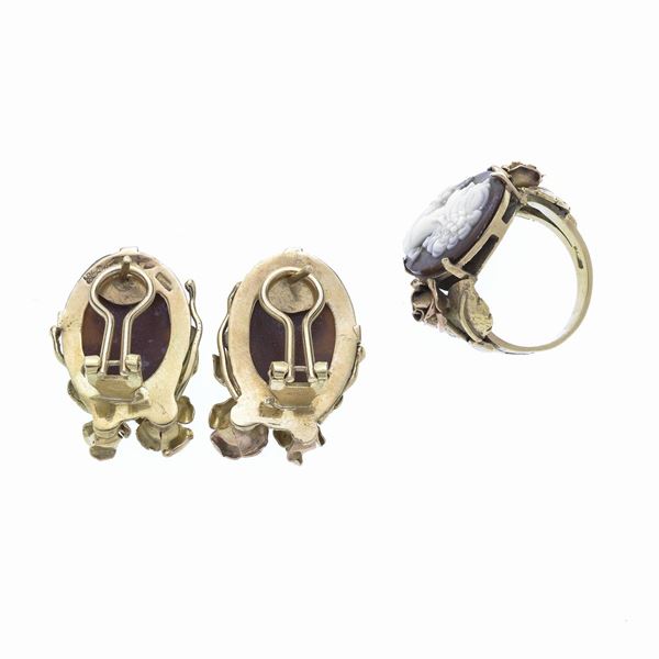 MATERIALE: oro giallo e cammei DESCRIZIONE: parure composta da anello realizzato con al centro cammeo ovale raffigurante profilo femminile all'antica su base in oro giallo modellata come una rosa e paio di orecchini en suite, firmati Oropa, recano il marchio 750 MISURE: anello 11, orecchini cm 1.7x2.5h PESO: gr 19.5