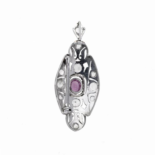 MATERIALE: oro bianco, diamanti e pietra rosa DESCRIZIONE: spilla pendente di ispirazione geometrica, realizzata a tricot, impreziosita con diamanti taglio rosa coronè, trasformabile in pendente MISURE: cm 4.5x 2h PESO: diamanti ct 1.0, gr 3.9