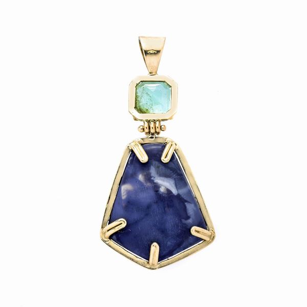 MATERIALE: oro giallo, smeraldo e opale DESCRIZIONE: pendente realizzato con berillo taglio quadrato a gradini e parte pendente impreziosita con opale taglio fantasia entro cornice in oro giallo, reca il marchio 750 MISURE: cm 2x4.4h PESO: berillo ct 2-50, gr 6.0