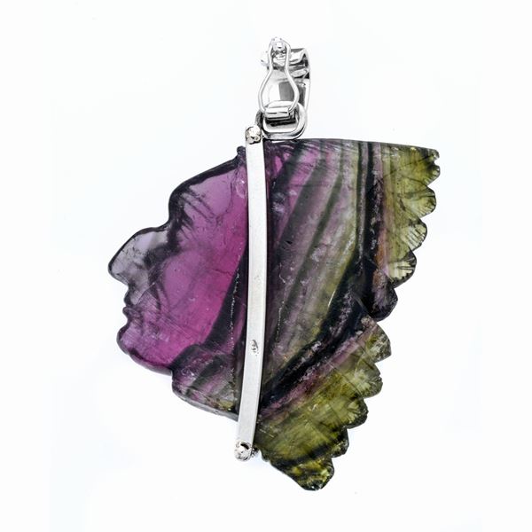 MATERIALE: tormalina, oro bianco e diamanti DESCRIZIONE: grande pendente realizzato con tormalina scolpita come un profilo di Indiano Pellerossa con copricapo impreziosito da una fascia di diamanti taglio brillante, reca il marchio 750 MISURE: cm 4x5h PESO: gr 29.3
