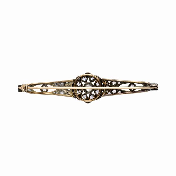MATERIALE: oro giallo, argento e diamanti DESCRIZIONE: spilla a barretta con margherita al centro, impreziosita con diamanti taglio vecchio che continuano sui lati, reca il marchio 750 MISURE: cm 5.5x 1.5h PESO: gr 7.1