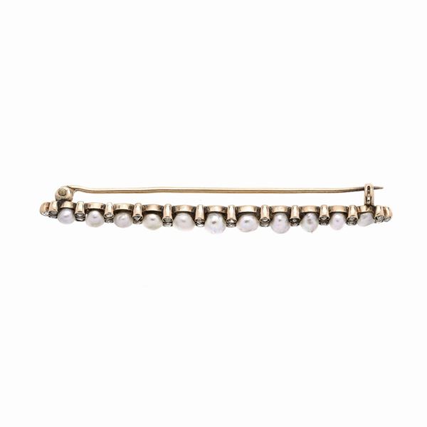 Spilla a barretta in oro giallo, diamanti e perle naturali