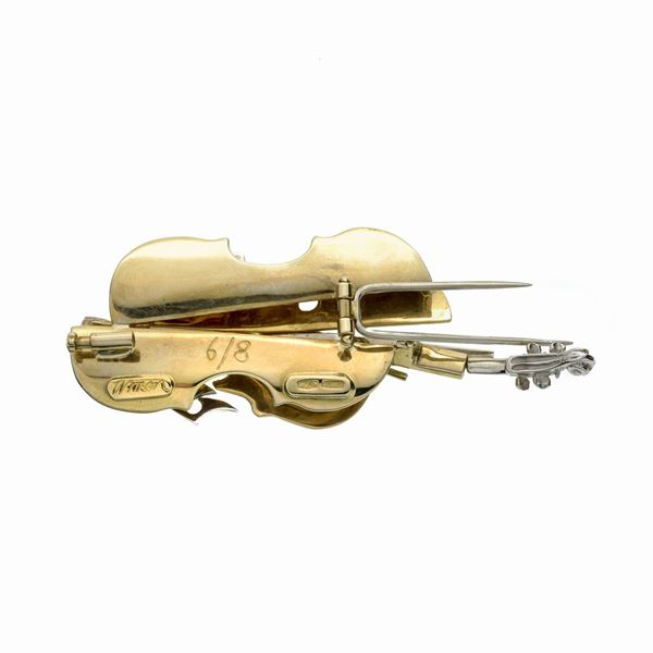 MATERIALE: oro bianco e oro giallo DESCRIZIONE: spilla appartenente alla serie di Violini realizzata in 8 esemplari, databile tra il 1990 e il 1991 come un violino scomposto, esemplare numero 6 su 8, firmata Arman, reca inciso 6/8 e il marchio 750 MISURE: cm 6.8x 2.6h PESO: gr 26.1