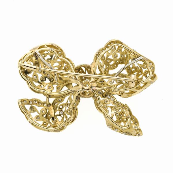 MATERIALE: oro giallo e diamanti DESCRIZIONE: spilla a fiocco di ispirazione floreale realizzata a tricot, interamente impreziosita con diamanti taglio brillante MISURE: cm 5.4x 4.2h PESO: gr 19.0