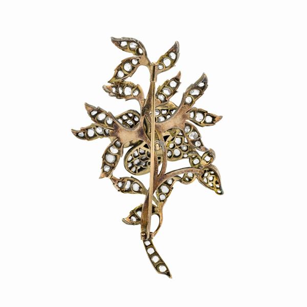 MATERIALE: oro a basso titolo, argento e diamanti DESCRIZIONE: spilla floreale realizzata come una rosa tra tralci di foglie, entrambi interamente impreziositi con rose di diamanti, la rosa ha un meccanismo en tremblant MISURE: cm 4.8x 7.5h PESO: diamanti ct 2.50, colore H-I, purezza VS, gr 25.2