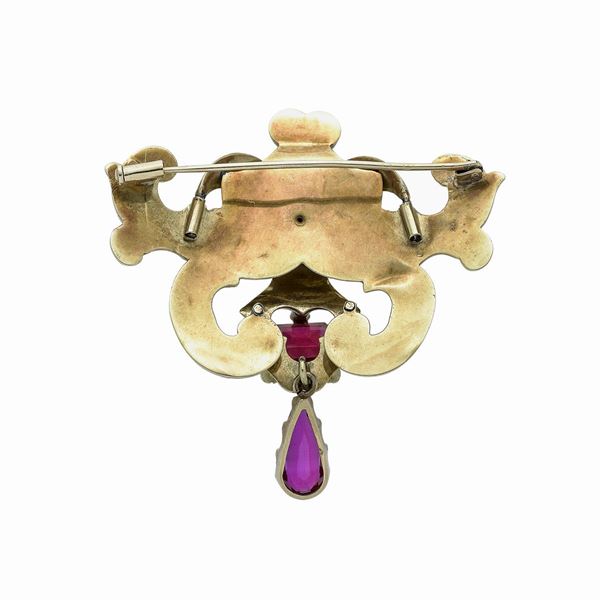 MATERIALE: oro a basso titolo e rubini sintetici DESCRIZIONE: spilla di ispirazione floreale realizzata con volute e girali intrecciati e incisi tra loro a formare un cartiglio, quest'ultimo impreziosito con due rubini sintetici, cadute allo smalto MISURE: cm 5.0x 5.3h PESO: gr 10.2