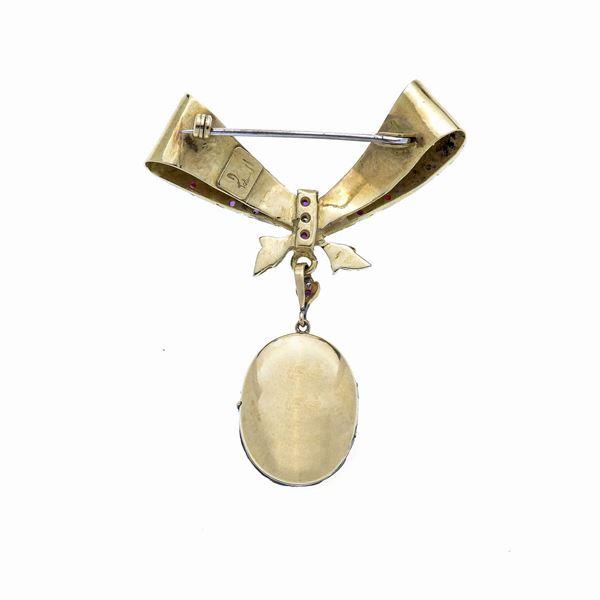 MATERIALE: oro giallo, diamanti e rubini DESCRIZIONE: spilla pendente porta ritratto realizzata come un grande fiocco impreziosito con motivi floreali, diamanti e rubini e pendente ovale porta ritratto dell'inizio del XX secolo anch'esso con fiore al centro e diamanti, il fiocco è firmato Passerini MISURE: cm 5.5x7h PESO: gr 31.9