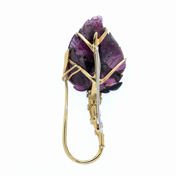 Spilla pendente in tormalina, oro giallo, oro bianco e diamanti