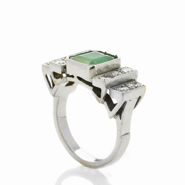 MATERIALE: oro bianco, diamanti e smeraldo DESCRIZIONE: anello realizzato con smeraldo taglio rettangolare impreziosito, su ogni lato, da cinque diamanti taglio brillante disposti su due file MISURE: anello 14 PESO: smeraldo ct 1.90 circa, diamanti ct 1.0 circa, colore H, purezza VS-SI, gr 8.5
