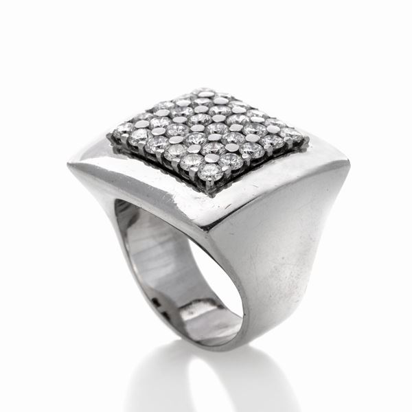 MATERIALE: oro biancno e diamanti diamanti DESCRIZIONE: anello a scudo interamente impreziosito da pavè di diamanti entro cornice quadrata, reca il marchio 750 MISURE: anello 15 PESO: ct 2.0 circa, gr 22.2