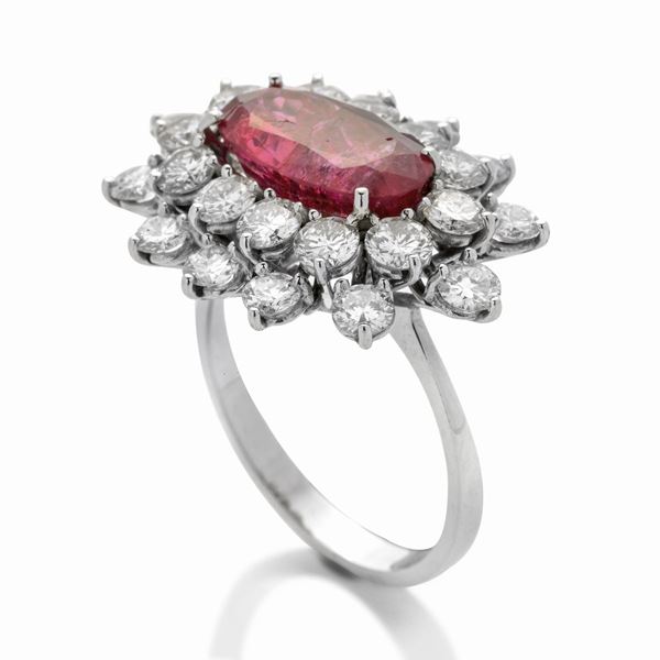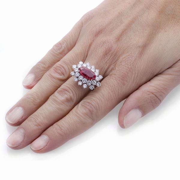 Anello in oro bianco, diamanti e spinello rosa naturale