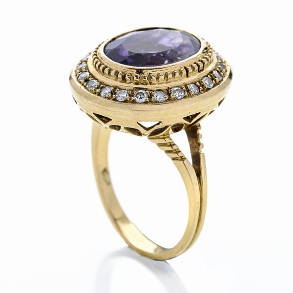 MATERIALE: oro giallo, diamanti e ametista DESCRIZIONE: anello realizzato con ametista di taglio ovale incorniciata con fascia a cordonetto in oro giallo e da un'altra fascia impreziosita con diamanti taglio brillante MISURE: anello 17 PESO: diamanti ct 0.25, gr 9.8
