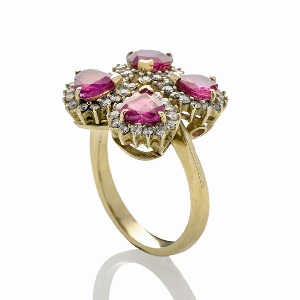 MATERIALE: oro giallo, diamanti e rubini DESCRIZIONE: anello realizzato come un quadrifoglio impreziosito con quattro rubini taglio cuore, incorniciati da diamanti taglio brillante, mancante di un diamante MISURE: anello 19 PESO: rubino ct 2.0, diamanti ct 0.48, H, SI, gr 10.5