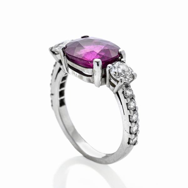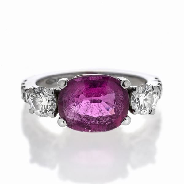 MATERIALE: oro bianco, diamanti e tormalina rosa DESCRIZIONE: anello realizzato con grande tormalina rosa di taglio ovale tra due diamante taglio brillante, i diamanti continuano anche lateralmente, reca il marchio 750 MISURE: anello 16 PESO: tormalina ct 3.80, diamanti rispettivamente ct 0.43, colore H, purezza IF e 0.43, colore G, purezza IF, gr 6.0