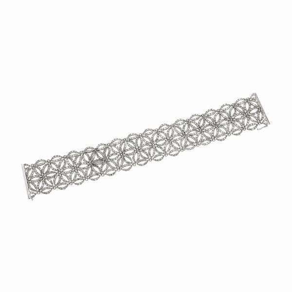 MATERIALE: oro bianco e diamanti DESCRIZIONE: bracciale, di ispirazione floreale, realizzato a tricot ad imitazione di un tessuto a fiori, intermanete impreziosito con diamanti taglio brillante e huit huit MISURE: aperto 18 PESO: diamanti ct 4.70, gr 36.2