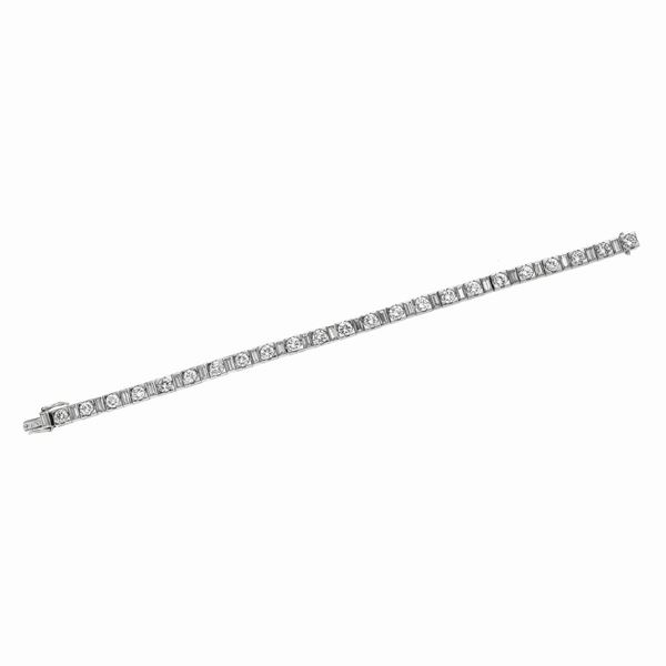MATTERIALE: oro bianco e diamanti DESCRIZIONE: bracciale tennis realizzato con diamanti taglio brillante alternati a diamanti taglio baguette, in alti castoni in oro biacno, reca il marchio 750 di difficile lettura MISURE: aperto cm 17.7 PESO: diamanti taglio brillante ct 4.60, colore G-H, purezza VVS, diamanti taglio baguette ct 2.0, colore G-H, purezza VVS, gr 31.1