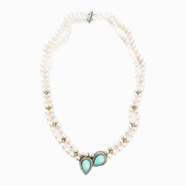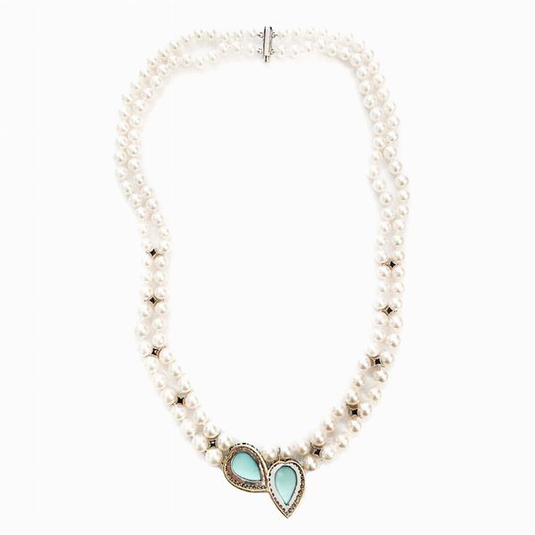 Collana in perle,oro giallo, oro bianco, diamanti e pasta di turchese