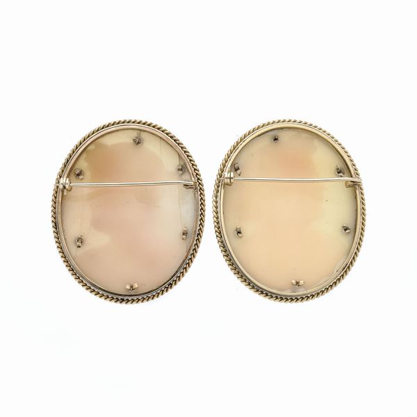Coppia di cammei in conchiglia, oro giallo, granati e turchese