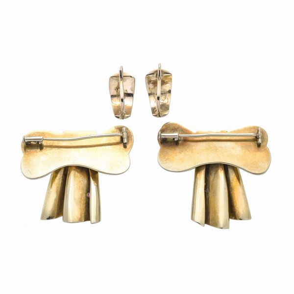 Coppia di spille Fiocco e paio di orecchini in oro giallo e pietre rosse
