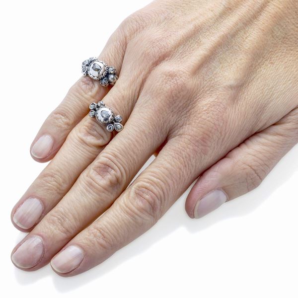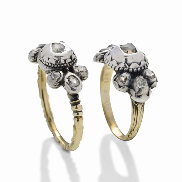 MATERIALE: oro a basso titolo, argento e diamanti DESCRIZIONE: anello relaizzato con una rose di diamante più grande, al centro, e tre più piccole per ogni lato, tutte incassate a notte e un altro anello simile MISURE: anelli 9 e 7 PESO: gr 8.9