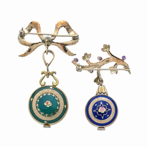 Due spille con orologio da tasca in oro giallo e smaltii colorati