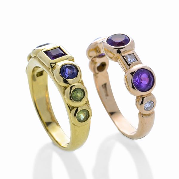 Lotto di due anelli in oro giallo, oro rosa, diamanti, ametiste e tormaline