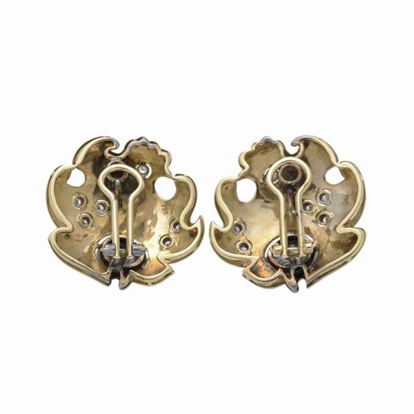 MATERIALE: oro giallo, diamanti e occhio di tigre DESCRIZIONE: paio di grandi orecchini a clips, ciascuno leggermente bombato realizzato con cornice sagomata impreziosito con diamanti taglio brillante e occhio di tigre taglio cabochon, ecano il marchio 750 MISURE: diametro cm 3.2 PESO: gr 23.1