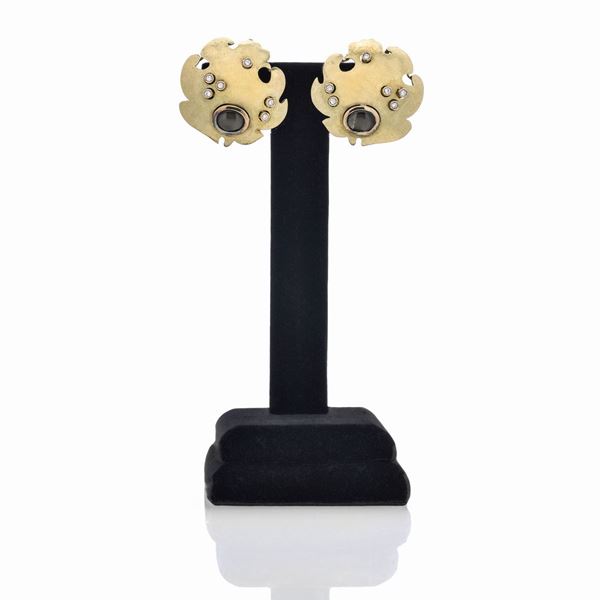 Paio di grandi orecchini in oro giallo, diamanti e occhio di tigre