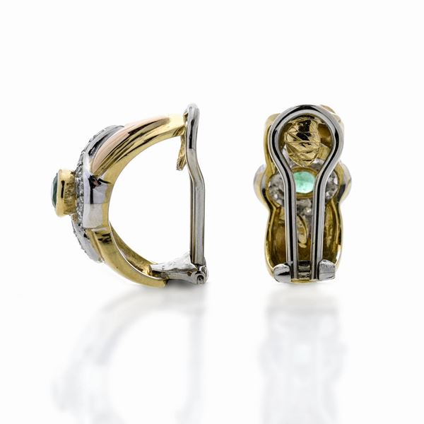 Paio di orecchini a clips in oro giallo, oro bianco, diamanti e smeraldo