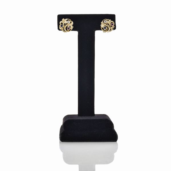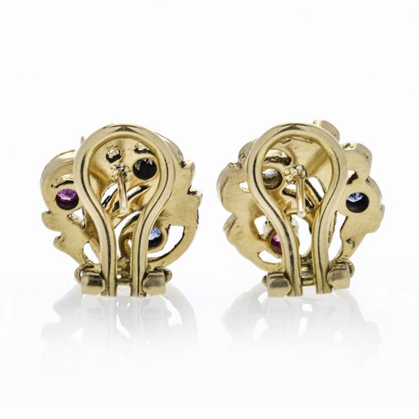 Paio di orecchini in oro giallo, diamanti, zaffiri e rubini