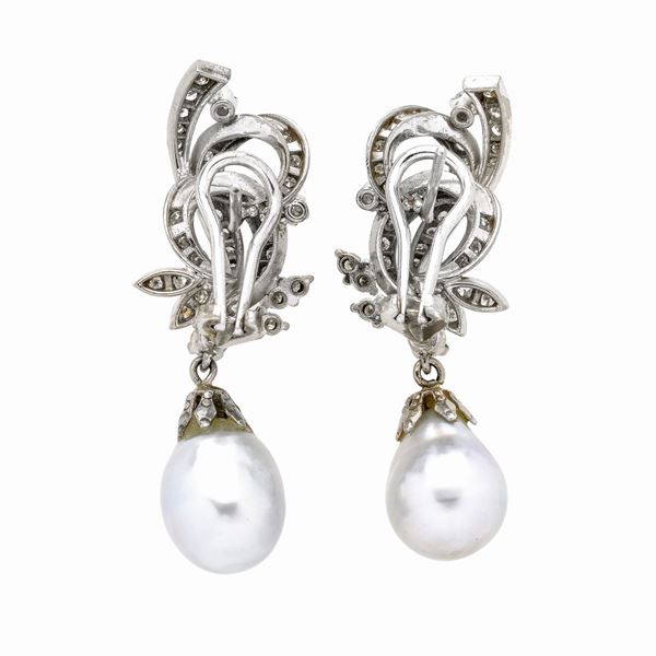 Paio di orecchini pendenti in oro bianco, diamanti e perla scaramazze