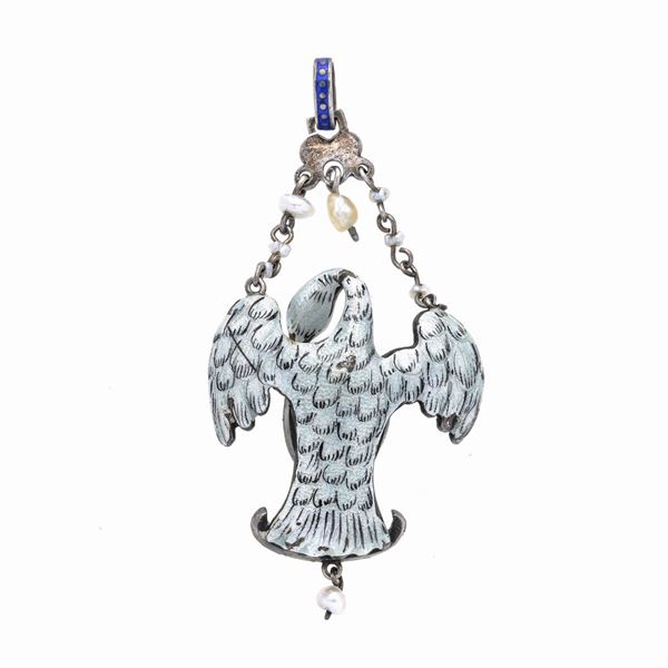 Pendente religioso Pellicano in argento, smalti colorati, rubini e perla mabè