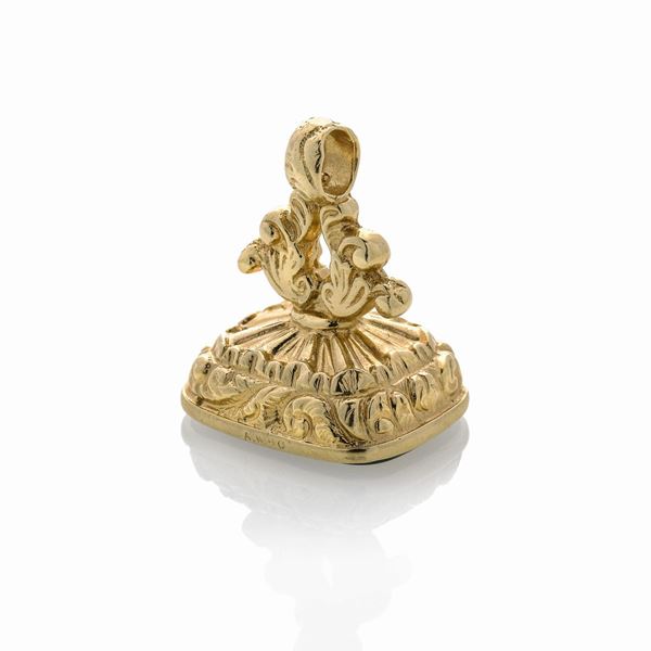 MATERIALE: oro a basso titolo e diaspro DESCRIZIONE: sigillo realizzato con presa con volute contrapposte e base con baccellature e fiori, nella parte posteriore diaspro con stemma nobiliare inciso MISURE: h cm 2.4, stemma cm 1.5 x 2 PESO: gr 12.7