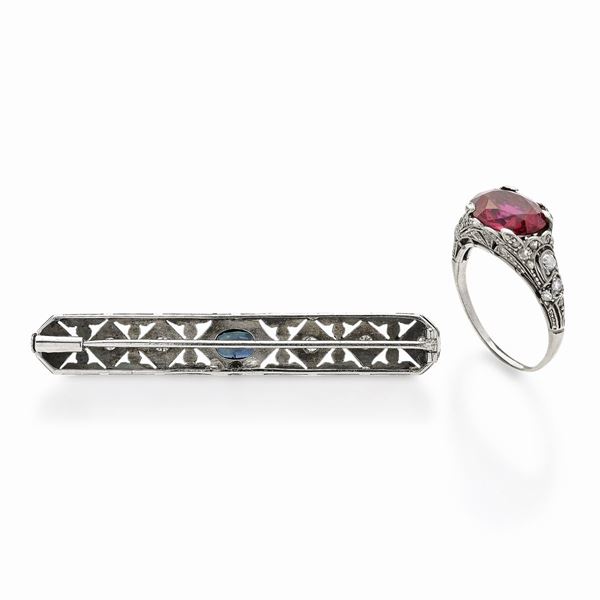 MATERIALE: oro bianco, platino, diamanti e pasta vitrea rossa DESCRIZIONE: spilla a barretta centrata da zaffiro taglio ovale e imprezisita con diamanti taglio vecchio e anello, centrato da pasta vitrea rossa, su base realizzata a tricot e imprezisita con diamanti taglio vecchio, con lieve difetto alla montatura MISURE: spilla lungh. cm 5, anello 12 PESO: gr 8.0